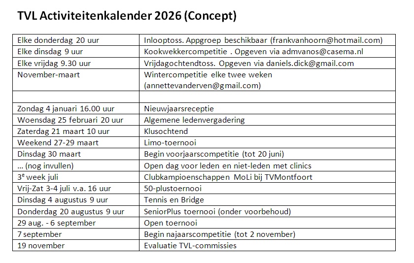 Onder voorbehoud ziet de activiteitenkalender van TVL er als volgt uit.